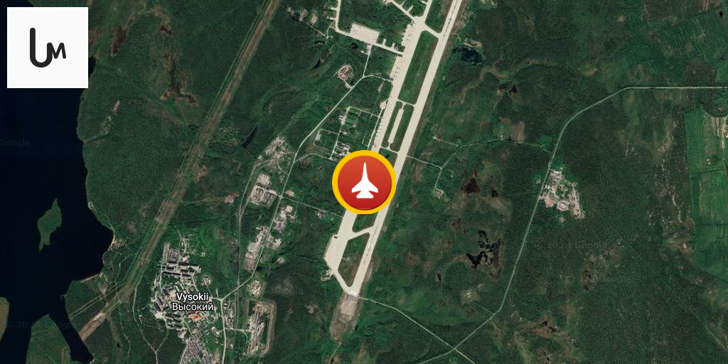Mehrere strategische Bomber vom Typ Tu-95MS sind vom Luftwaffenstützpunkt Olenya aus in der Luft