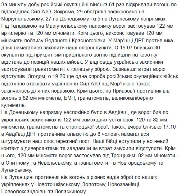 Situation in ATO: Russian force used self-propelled artillery, 120 and 82 mm mortars. Sabotage group tried to take under control Ukrainian checkpoints in Marinka