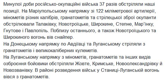 ATO HQ: Ru forces 37 times violated ceasefire, shelling with 122mm artillery in Talakivka, Novotroitske, Shyrokyne, Stepne , Mariynka, Hnutove&Pavlopil