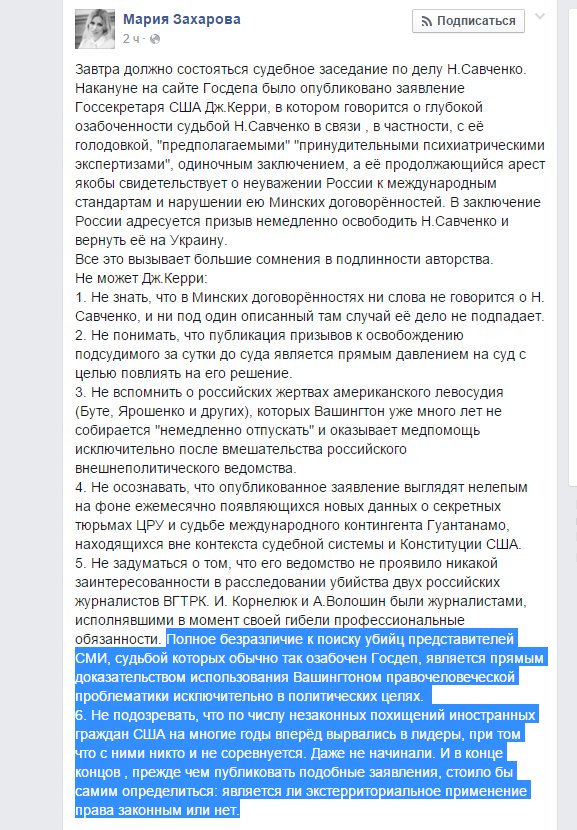 Russian MFA spox Zaharova in Facebook post on Savchenko blaming US in kidnapping of foreign citizens, inderectly admitting that Savchenko was kidnapped