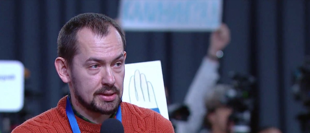 Ukrainian journalist Roman Tsymbalyuk asks Putin whether he will authorize full swap of POWs in eastern Ukraine and continue to pursue his "absurd policy" regarding peacekeepers; tells him fighters under his control in Donbas are massacring people. (Russian journos boo.)
