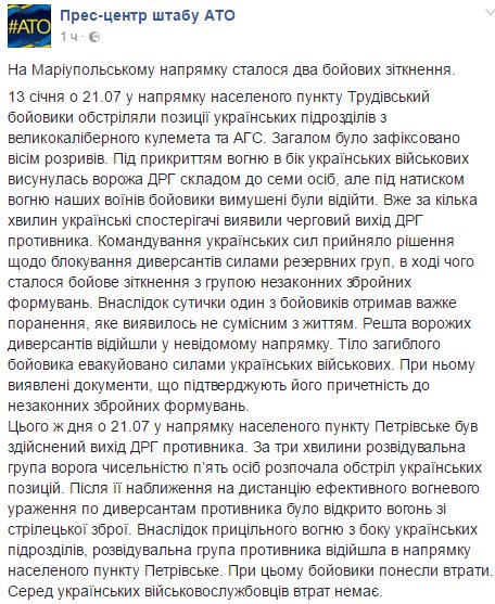 Russian forces made 2 simultaneously attempts to attack Ukrainian positions at Trudivske and Petrivske yesterday night. 1 body of Russian militant evacuated from battlefield by Ukrainian soldiers