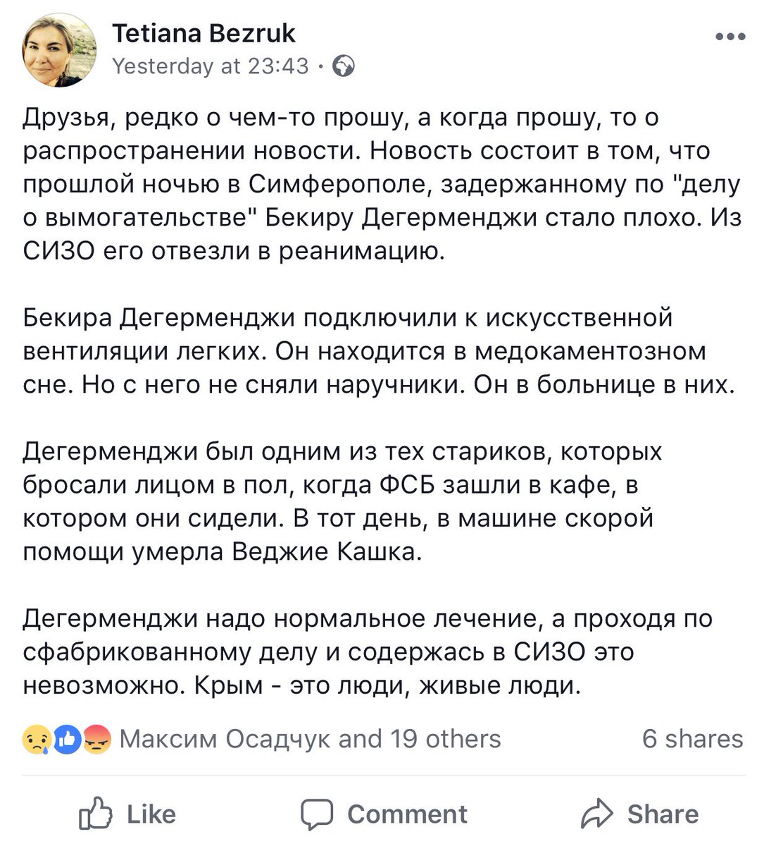 Arrested Crimean Tatar activist Bekir Degermendzhi admitted at intensive therapy ward in Simpheropol, now in induced coma with artificial lung ventilation. But still handcuffed