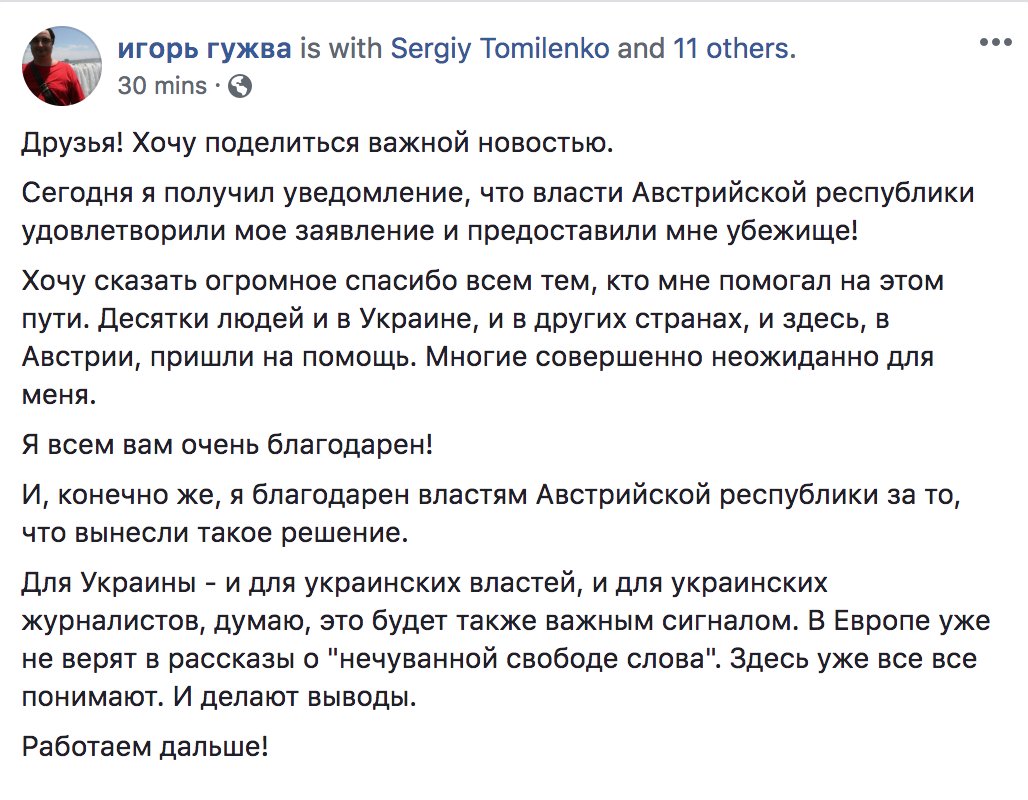 Igor Guzhva, controversial editor of @stranaua who fled Kyiv after Ukrainian authorities opened criminal investigation of him, says Austria has granted him asylum.