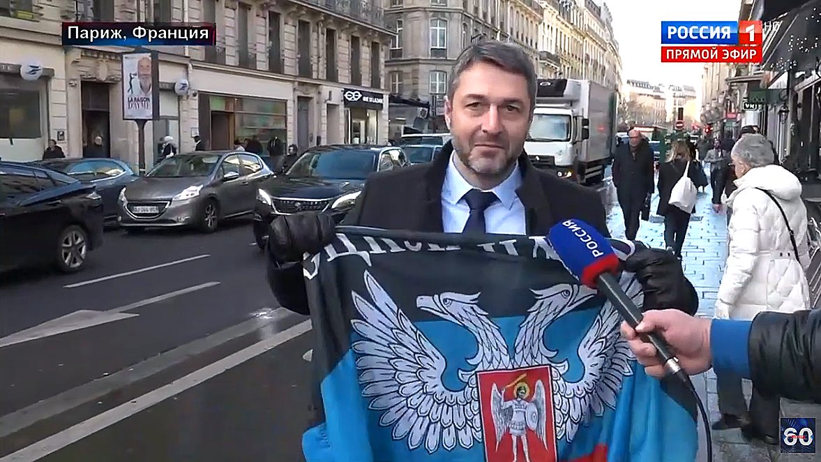 Moreau at Russian State TV says he is proud to be a citizen of the greatest country in the world [he is a dual citizen of France and Russia] takes the flag of "DPR" [Russia's fake "republic" in Ukraine] out of his pocket, says he wouldn't mind if the Kremlin sent him money [then adds it's a joke].