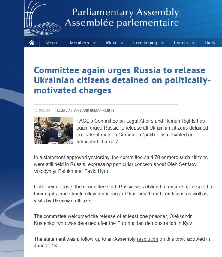 The @PACE_LegalHR Committee has again urged Russia to release all Ukrainian citizens detained on its territory or in Crimea on "politically motivated or fabricated charges".