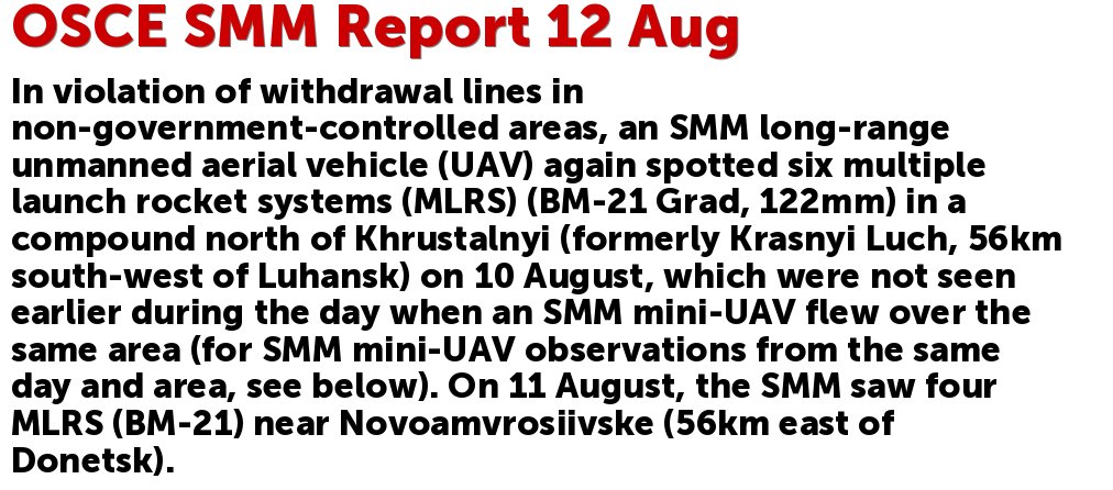 OSCE SMM Report 12 Aug: In violation of withdrawal lines in non-government-controlled areas, an SMM long-range unmanned aerial vehicle (UAV) again spotted six multiple launch rocket systems