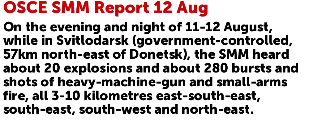 OSCE SMM Report 12 Aug: On the evening and night of 11-12 August, while in Svitlodarsk (government-controlled, 57km north-east of Donetsk), the SMM heard about 20 explosions and about 280 bursts and shots of heavy-machine-gun and small-arms fire
