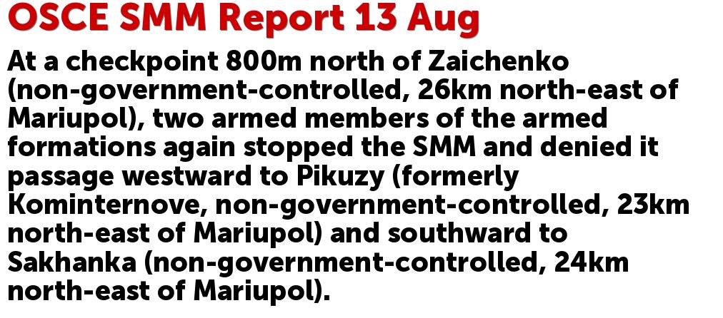 At a checkpoint 800m north of Zaichenko (non-government-controlled, 26km north-east of Mariupol), two armed members of the armed formations again stopped the SMM and denied it passage westward to Pikuzy (formerly Kominternove, non-government-controlled, 23km north-east of Mariupol) and southward to Sakhanka