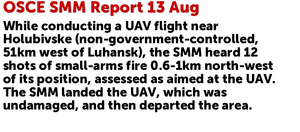 While conducting a UAV flight near Holubivske (non-government-controlled, 51km west of Luhansk), the SMM heard 12 shots of small-arms fire 0.6-1km north-west of its position, assessed as aimed at the UAV