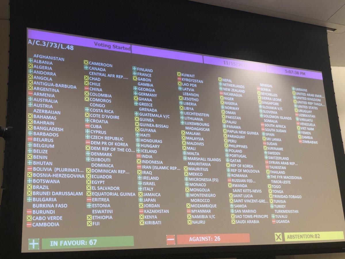 Table of how States voted in UNGA committee on draft resolution condemning human rights violations by the occupying power Russia Russia in Ukraine's Crimea Final approval of the document will be held in December In Favour: 67 Against: 26 Abstentions: 82