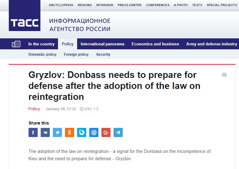 Russia's envoy to the Contact Group for settlement in Ukraine's southeast Boris Gryzlov said that "Donbas needs to prepare to defend itself" after Ukraine's parliament passed the law on Donbas reintegration