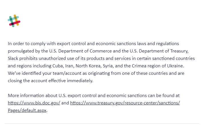 Slack began banning users who visited US-sanctioned countries. Cuba, Iran, North Korea, Syria, and Ukrainian region of Crimea. It sends such emails to users