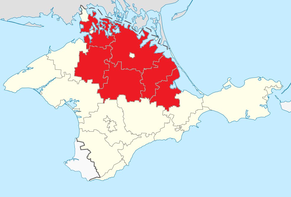 This is the map of the districts in Crimea experiencing severe drought and water shortage (in red). Previously they relied on water supply from mainland Ukraine a freshwater canal, blocked