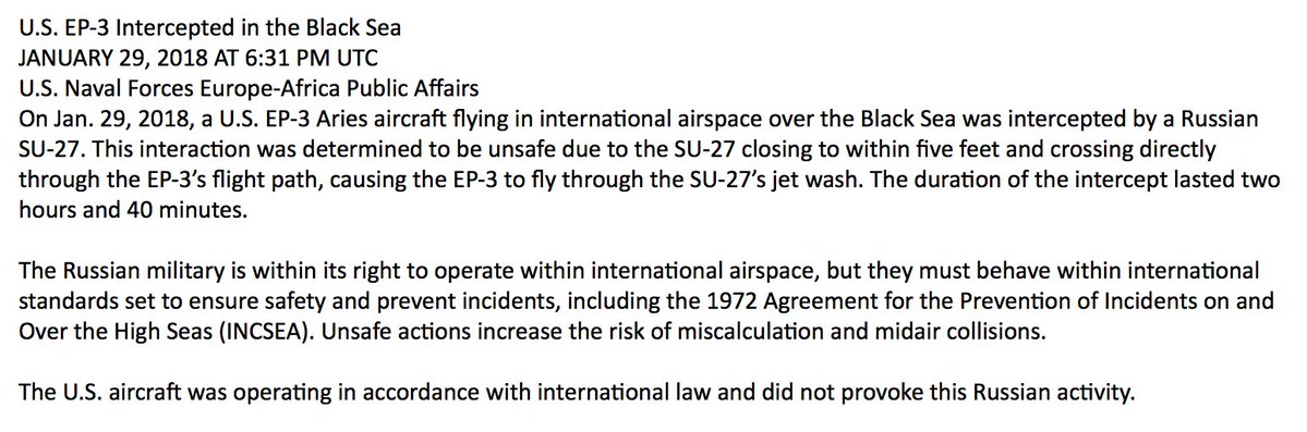 U.S. Naval Forces Europe confirms "unsafe" Russian intercept of a US EP-3 Aries over the Black Sea, saying the Russian fighter came within five feet of the American plane.
