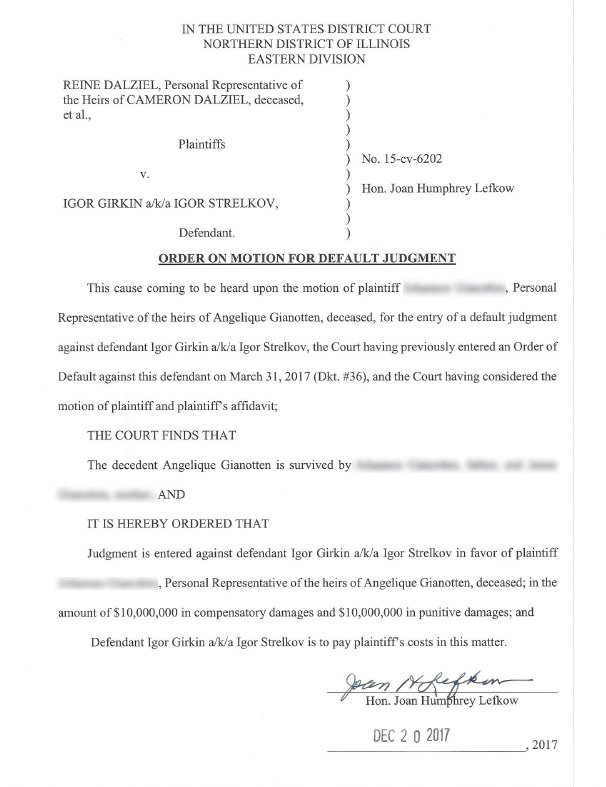 Family members of 25 MH17 victims have won a case in a U.S. court entitling them to seek $20 million in compensation each from Igor "Strelkov" Girkin, Russian who commanded forces in eastern Ukraine in 2014. Report concedes chance of payout is "zero."