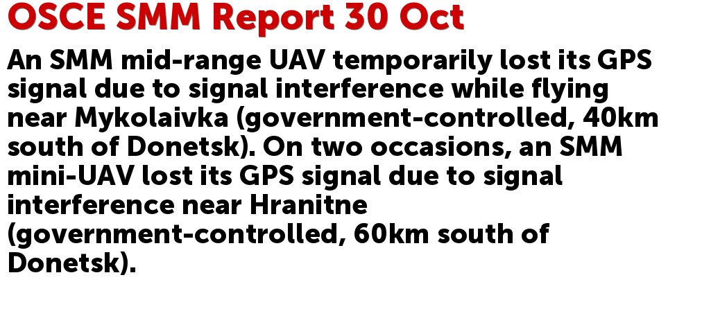 OSCE SMM Report 30 Oct: An SMM mid-range UAV temporarily lost its GPS signal due to signal interference while flying near Mykolaivka (government-controlled, 40km south of Donetsk)