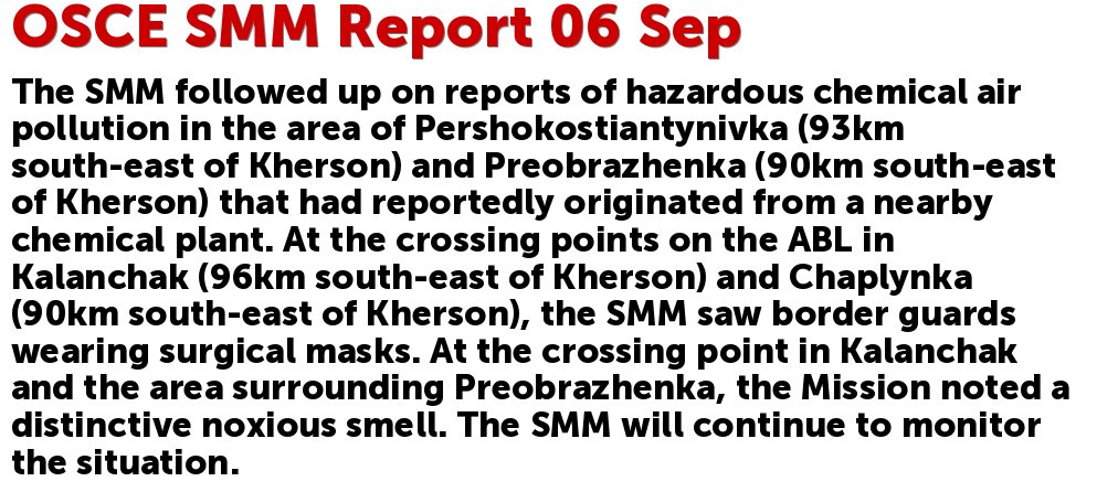 OSCE SMM Report 06 Sep: The SMM followed up on reports of hazardous chemical air pollution in the area of Pershokostiantynivka (93km south-east of Kherson) and Preobrazhenka (90km south-east of Kherson)