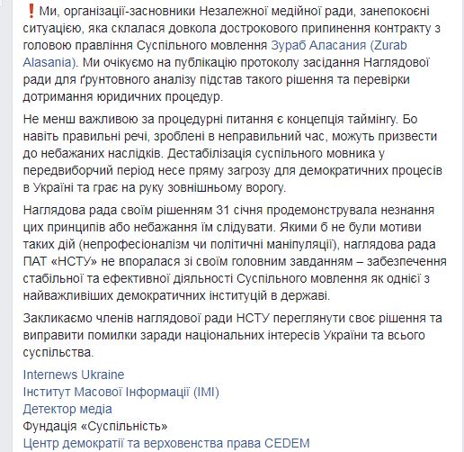 Ukraine's top media organizations expressed concerns over the dismissal of Alasania from Suspilne. Said they are waiting for the minutes of the Jan. 31 meeting of the supervisory board to be published in order to give it a thorough analysis and check legal compliance