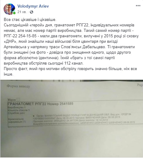 112 TV channel in Kyiv was attacked with grenadelauncher RPG-22 from same series that grenadelaunchers hat were seized from DNR militants cache near Bakhmut