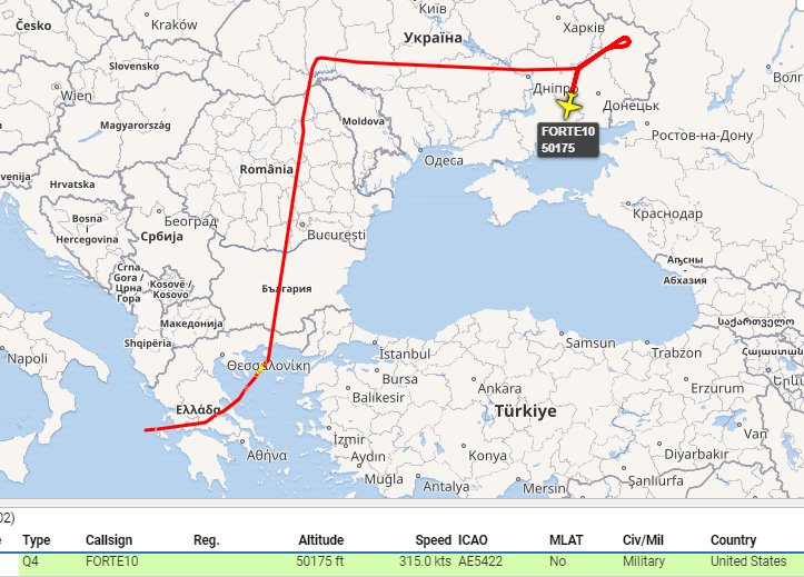 FORTE10 RQ4B Global Hawk USAF UAV out of Sigonella, Sicily, on high-altitude (50000ft) surveillance mission over Donbas region of Eastern Ukraine. 1207z