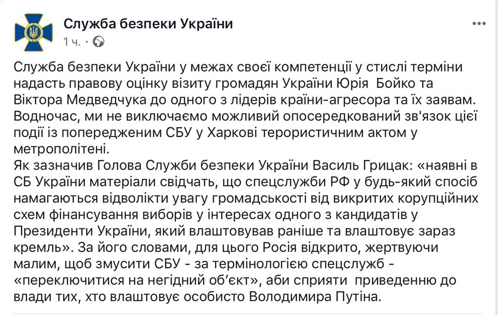 Security Service of Ukraine on Boiko and Medvedchuk visit to Moscow: Russian special services attempting to divert our attention from real threats to Presidential campaign in Ukraine