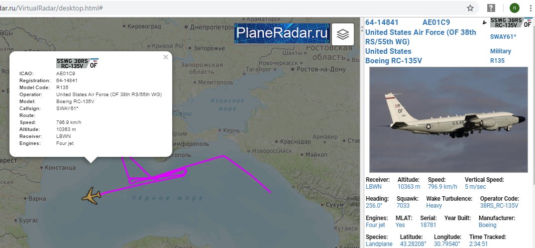 SWAY61 6414841 USAF RC135V RivetJoint carrying out Intelligence mission over the Black Sea, surveilling Russian-occupied Crimea, Kerch Straits and SW Russian coast.