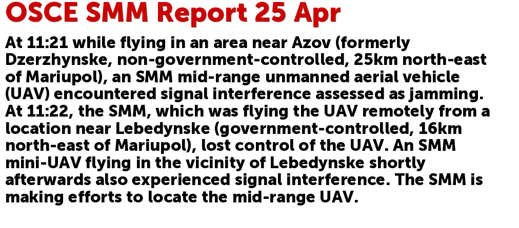 OSCE SMM on 25 April at 11:21 while flying in an area near Azov (formerly Dzerzhynske, non-government-controlled, 25km north-east of Mariupol), has lost it's mid-range unmanned aerial vehicle