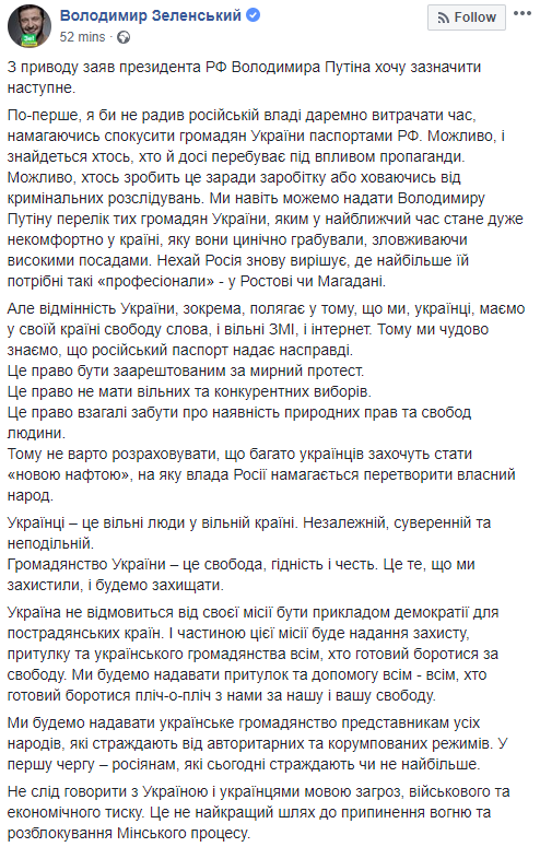 President-elect Zelensky has prepared big response to Putin's order to give Russian passports to citizens of occupied territories of Donbas: Do not threat Ukraine