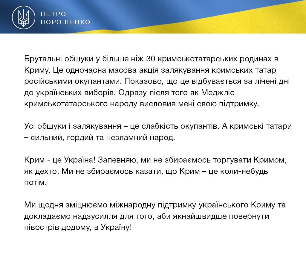 President Poroshenko condemned searches of Crimeantatars homes in Crimea, express support for families of those who were arrested and Crimeantatar people