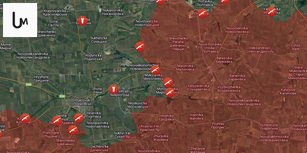 At Pokrovsk direction clashes yesterday near Popiv Yar, Volodymyrivka, Razine, Kotlyne, Myrne, Novoekonomichne, Myrolubivka, Shevchenko, Zvirove, Udachne, Horikhove, towards Pokrovsk, Molodetske, Oleksiyivka and Muravka, - General Staff of Armed Forces of Ukraine reports