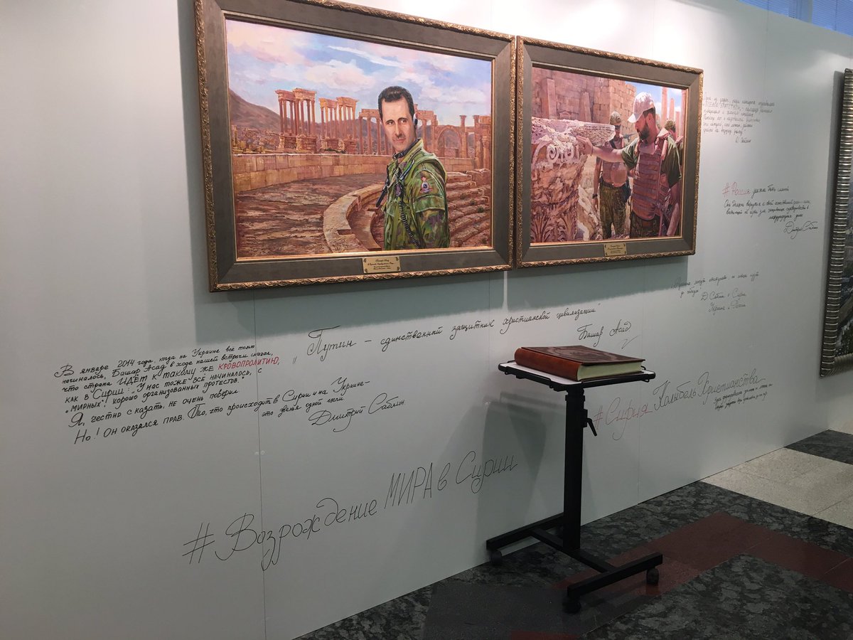 Dans les coulisses de la Douma, il y a une exposition intitulée «Restoring Peace» - sur la Syrie et le Donbass. La citation sous le portrait d\'Assad lit \"Poutine est le seul défenseur de la civilisation chrétienne\"